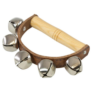 5-bell sleigh bell with a wooden handle and leather-style strap.